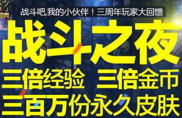 lol英雄联盟将于2014年9月20日19:00至22:00开启战斗之夜三周年大回馈活动,玩家在指定时间登录游戏客户端并参与游戏,即可享受3倍经验与3倍金币奖励,并有机会赢取永久皮肤和专属头像,这里给大家分享下lol英雄联盟9月20日战斗之夜活动介绍,免费得永久皮肤专属头像。