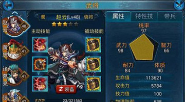 赵云是个军团型武将,就是比较适合带兵的。他适合带骑兵和枪兵,没有的时候可以先带步兵放前排。格挡和吸血是他的生存技能,格挡可以让对方打不中,吸血的话,如果伤害越高,吸的血自然会越多。一个武将可以打3个被动技能+1个饰品(饰品目前只有花钱才能获得,未来不知),等到了13级城主府的时候,装备就可以炼化出更多的属性了。