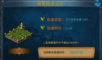 另外一个小细节可以提高粮食产量的就是每个农田都有用绿钻加速的功能,发现还是很合算的,13级农田,每个农田的每小时产粮是1412(12级种植术),加速6小时的绿钻花费是80,加速后产粮提高100%也就是说每80绿钻可以换1412X6=8472粮草,如果刷将牌的话每次需要1714(13级主城)可以刷5次,也就是说每160绿钻可以刷将牌10个,按照目前的概率大约每10次可以出一个到两个银牌(看各人人品)也就是说160绿钻可以得到1-2个银牌和9个铜牌,很合算有木有?!!还有一点点的几率直接得到金牌呢!