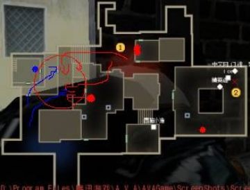 在这个战术里,红方冒险在1点布置下一个狙击手,1个步兵从黑暗的阁楼快速通过,突前防守,1个侦查+1个步兵从1点西侧楼梯直冲对方出生地。在2点只有一个步兵防守。