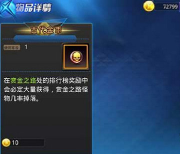 古代金币是赏金之路的产物,也只有在赏金之路里才能获得,玩家在赏金之路排行榜上冲刺排名,可以获得大量古代金币,其次,在赏金之路闯关中怪物也有几率掉落古代金币。