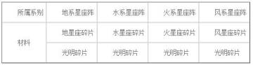 相同属性的低级碎片可以合成光明碎片,每个光明碎片需要10个低级碎片进行合成,合成时需要消耗金币,每个阵法的最高等级都是10级,每级所需要的星座碎片数量不同。