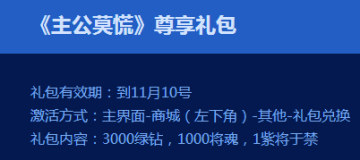 在主公莫慌游戏中,截至11月10日,玩家都可以免费获得尊享礼包,礼包包含紫将、绿钻、将魂等丰厚奖励,下面给大家分享下礼包激活码和礼包内容。