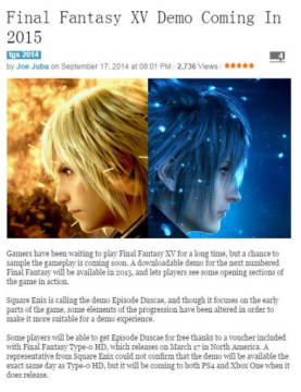 相关攻略 《最终幻想15》进度缓慢 FF15试玩版或将延期 《最终幻想15》技术演示视频 画面效果逼真到 《最终幻想15》或许将用虚幻4引擎打造 战斗行云流水《最终幻想15》战斗系统影像欣 《最终幻想15》开发进度达成55%