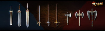 目前已经的兵器的种类分别有:波斯弯刀、圣火令、西洋剑、锤、长枪、唐刀、伞、判官笔、长钩、重剑。兵器与武学集合了中原、西域、外域不同文化民族的特色。在【侠客行】中无论是武学还是武器都将呈现出百花齐放之势。