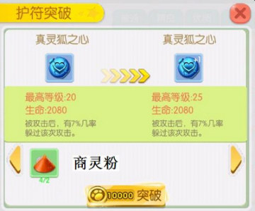 紫色品质(优秀)进阶到紫色+1品质(优秀)需要一个同名、同品质、同级别的紫色品质护符、3个商灵粉、3个魔灵粉和3个黄灵粉(英雄沼泽之地10、星云丘陵10、龙之领域10掉落),如图: