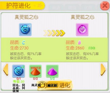 蓝色+2品质(良好)进阶到紫色品质(优秀)需要一个同名、同品质、同级别的(蓝色+2品质)护符、2个商灵粉和2个魔灵粉,如图:
