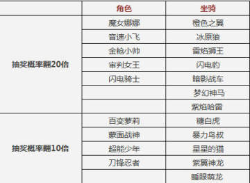 活动内容:活动期间,永久时限的角色、坐骑最高概率翻20倍!小伙伴们可不要错过了。