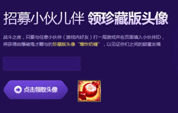 lol英雄联盟爆炸奶糖头像可以免费领取,在9月20日的战斗之夜,只要与任意小伙伴打一局游戏并在页面填入小伙伴ID,将获得由爆破鬼才赠与的珍藏版头像“爆炸奶糖”,这里给大家分享下lol英雄联盟爆炸奶糖头像免费领取地址。