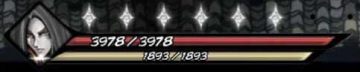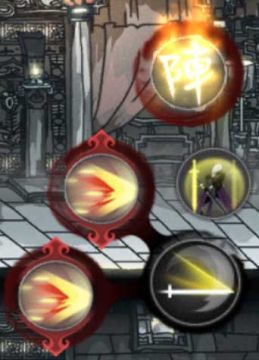 该区块包含了人物头像、怒气槽、杀意、生命值、护甲值。怒气槽与人物头像为一体,当人物战斗中不断的击中敌人就可以使怒气槽增长(就是人物头像处的蓝色蒙板效果),当涨满的时候技能栏将出现“阵”字图样的图标,可以用来施放角色的终结技能,本节后面详述。生命值为角色血量,护甲值为角色所拥有的护甲值,人物属性中详述。生命值上方为杀意,将在在杀意系统中详述。