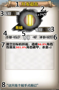 技能的相关说明 包括技能的行为作用、造成的伤害/破甲数值和和杀意的增减,如果为消耗杀意,则会出现关于消耗杀意的说明。