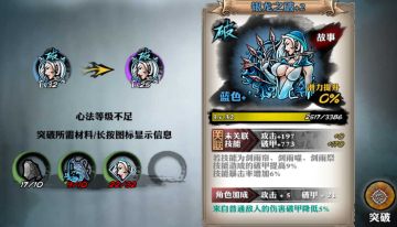 心法、卷轴、书籍的当前等级到达MAX(也就是可以看到心法突破的图标微微发红的时候),便可以进行心法突破并提升到下一个级别,突破的时候显示突破所需的道具,如满足条件,即可进行突破,突破后的心法等级将会降低。