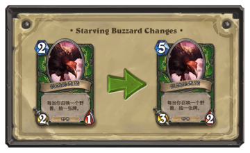 饥饿的秃鹫(猎人)现在的法力值消耗改为5点(从2点上调),具有3点攻击力和2点生命值(从2点攻击力和1点生命值上调)。