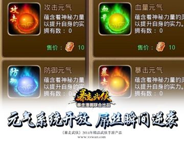 参加武林大会的各路英雄,可获得具有攻击、防御等加成的十种元气。装备元气将大大提高玩家战斗力,玩家的侠客装备上对应的元气,就会增加对应的属性,同侠客的每一个元气槽需要侠客等级达到对应等级才会开启,英雄豪杰们,升级为王,屌丝逆袭不是梦!