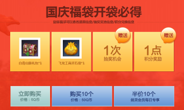 剑灵为和灵芝们欢度国庆,特推出飞龙工商国庆欢享福袋,打开可以得到白青山脉礼包,灵石袋和特殊抽奖积分哦。