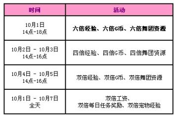 10月1日14-18点期间,我们为大家准备了六倍经验、六倍G币、六倍舞团资源活动!其他活动期间我们也同样为大家准备了四倍、双倍活动!