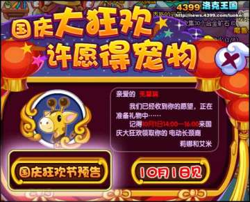 3、许愿后,在国庆当天,这只宠物就可以发送给小洛克啦!还可以查看国亲狂欢的更新内容预告哦!