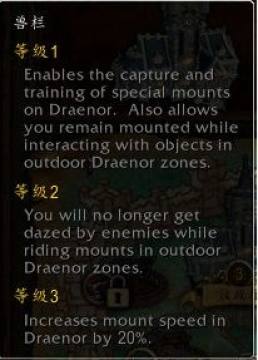 允许在德拉诺捕捉和训练特殊的坐骑。同时允许你在德拉诺户外区域与物体互动时保持骑乘状态。