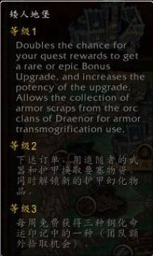 使你的任务奖励升级为稀有或史诗品质的几率翻倍,并提高升级的幅度。可以从德拉诺的兽人氏族处收集护甲碎片,用于进行护甲的幻化。
