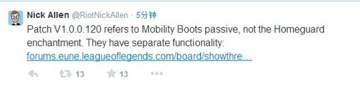 “关于‘战斗状态’的定义出现在1.0.0.120版本补丁说明当中,这个描述仅仅是为了说明5速鞋被动的生效方式,这和此后的‘家园卫士附魔’没有任何关系。两者的功能是不一样。”(小编注:1.0.0.120版本补丁是2011年6月的事情了,那时候确实没有家园卫士附魔一说。)