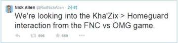 “我们正在调查Fnatic与OMG比赛中关于卡兹克与家园卫士产生的问题。”
