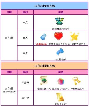 10月3日15点在线即可获得2014点券、永久徽章。
