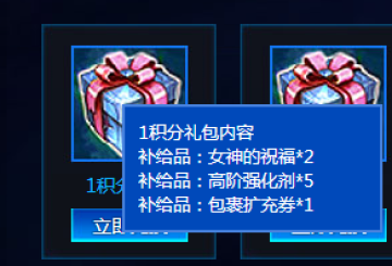大家可以看到这个1积分礼包里面包含了2个女神的祝福,5个高阶强化剂以及一个包裹扩充卷,相当的划算有木有。
