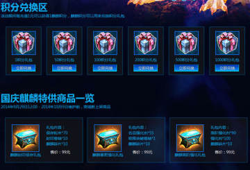 2.消耗麒麟积分可以在本活动页面兑换不同积分值的积分礼包。“1积分礼包”每个账号仅可兑换一次,其他积分礼包可无限次重复兑换。麒麟积分在2014/10/8 23:59后失效, 请及时兑换。兑换礼包时请注意选择大区和服务器,确定之后不可更改。兑换成功后系统会自动发放礼包到游戏中,