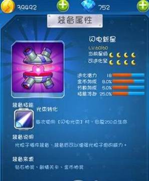 《全民飞机大战》闪电新星怎么得 闪电新星属性技能介绍 来源: 飞翔小编 2014/9/30 16:37:28 浏览量:1047 《全民飞机大战》闪电新星怎么得?下面就给大家介绍一下闪电新星的获取方法以及属性技能。全民飞机大战更新新版,出了很多装备。作为最新版本最强的装备之一----闪电新星。一起来了解闪电新星的相关信息。 闪电新星等级:LV55可进化至:进化潜力:18分数加成:4%技能冷却:19.2%金币加成:8%装备来源:钻石抽奖、剧情关卡、金币抽奖装备技能:光束转化--每次使用【闪电光束】时,回复220点生命。装备说明:光粒子插件装备,装备后可以增强光粒子炮的威力。