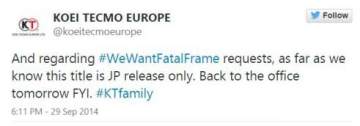 因为就在昨日,光荣特库摩欧洲在其Twitter上称《零:濡鸦之巫女》将仅限日本地区,原文如下: