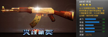 总体评价:外观不错,全身金黄,弹夹上镶嵌有七彩宝石。但是后坐力太大,稳定性差,而且又有些重,拿起来不方便。但是杀伤力确实不错,离对手近一些击杀数还是比较可观的,全身各部分的伤害只比“神器”逆鳞低1~10左右的伤害,不算太多,只要会控制,找对作战位置,作战距离适宜,确实可以杀出像AK47逆鳞那样的效果!(当然,无论如何神器逆鳞都要好些,各方面来讲,更实用)