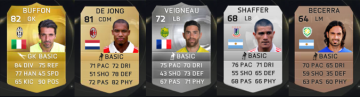 从左至右分别为传奇卡(XBOX平台独享)、年度蓝卡(入选年度最佳阵容TOTY的球员)、赛季蓝卡(入选了赛季最佳阵容TOTS的球员)黑卡(入选周最佳阵容的球员)、橙卡(当选杯赛最佳球员)