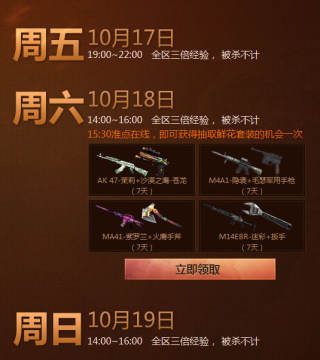 CF穿越火线将于2014年10月1日至10月30日开启10月周末痛快玩活动,其中第三周活动将于10月17日至10月19日举行,活动期间准点在线将送鲜花套装,全区三倍经验,被杀不计,这里给大家分享下CF穿越火线10月17日至10月19日周末痛快玩第三周活动介绍,鲜花套装领取地址一览。