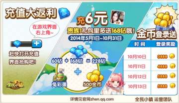 活动规则:《全民小镇》登录有礼。活动期间,镇长每日上线,即可通过游戏邮件收到登录礼包一份,金币从天降,人人有份。