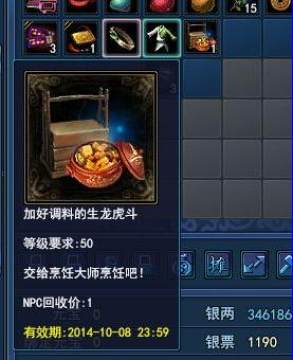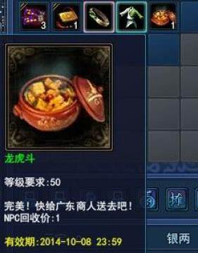 《倩女幽魂2》龙虎斗制作攻略 来源: 飞翔小编 2014/10/9 8:59:10 浏览量:391 《倩女幽魂2》国庆美食任务到了最后一环啦,下面教你制作最后一道菜“龙虎斗”,一起来看看吧。先接任务,找的是这个NPC国庆美食任务攻略先买3份蛇、1份猫、1份母鸡、3份炭国庆美食任务攻略将蛇、猫、母鸡都交给疱长处理好国庆美食任务攻略然后把三样处理好的材料交给调味大师制作成【加好调料的生龙虎斗】国庆美食任务攻略最后把生龙虎斗+3份炭找烹饪大师制作,就完成了国庆美食任务攻略