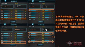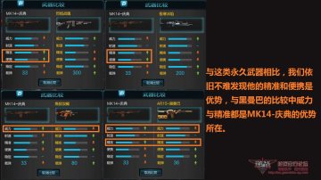 与永久武器相比精准和便携是MK-14庆典的优势所在,在与AR15-黑曼巴相比中我们可以看出威力依旧是MK-14庆典的优势,而在射速方面是持平的,在精准方面也是优秀于AR15-黑曼巴,但在便携、稳定以及载弹量上都稍稍逊色。