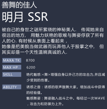 在锁链战记游戏中,10月9日更新后,魔神活动酒馆关闭,“善舞的佳人明月”、“应援的少女铃铛”将于活动结束后分别加入副都、圣都酒馆,这里给大家详细介绍下5星SSR法师善舞的佳人明月的属性和技能。