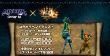 Capcom将与任天堂进行联动合作,银河战士萨姆斯将参战《怪物猎人4G》。在官方联动宣传片中,玩家可以使用主角萨姆斯铠甲和人型两套装备,并且有银河战士外形的各类武器可供使用,例如重弩,操虫棍,双刀等。《怪物猎人4G》银河战士任务预计12月17日在日本711便利店先行配信。
