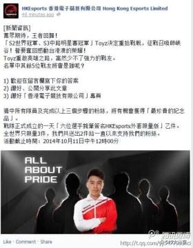 今日,香港电子竞技有限公司在FB上宣布,S2冠军中单Toyz将会重新回归战场。