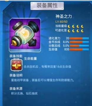 装备技能:生命能量--击杀敌机后,有概率回复18点生命值。