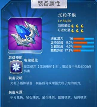 《全民飞机大战》加粒子炮属性技能介绍 来源: 飞翔小编 2014/10/10 17:06:29 浏览量:214 加粒子炮是全民飞机大战中推出的三级月亮装备,那么这个装备怎么样呢?下面就随我来一起看看吧。加粒子炮最高等级:LV55可进化至:月亮3进化潜力:16金币加成:8%分数加成:4%技能冷却:17.8%装备来源:钻石抽奖、积分兑换、金币抽奖、剧情模式、经典模式装备技能:电轮强化--每次使用【炫光电轮】时,增加每个电轮5000点伤害。装备说明:光粒子插件装备,装备后可以增强光粒子炮的威力。
