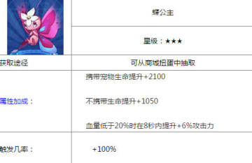天天炫斗怎么获得蝶公主属性加成是什么 来源: 飞翔小编 2014/10/11 10:55:20 浏览量:273 今天小编为大家带来天天炫斗怎么获得蝶公主属性加成是什么,这只宠物的加成主要是在生命值方面和贫血爆发的时候,100%的触发几率还是很有用的,想要的玩家们快按照攻略去获得蝶公主吧。
