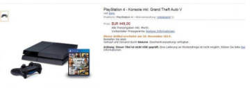 《侠盗猎车手5》PS4主机同捆套装11月18日发售 来源: 飞翔小编feichenpan 2014/10/11 21:30:39 浏览量:247 最近德国、意大利、西班牙的亚马逊购物官网上都曝光了《侠盗猎车手5》PS4主机同捆套装,该套装预计将于本作一同于2014年11月18日发售上市,其售价定为449.99欧元。根据亚马逊官网目前公布的情报来看,《侠盗猎车手5》PS4主机同捆的正式包装还未公开,只是简单的主机加游戏封面的形式,或许之后会公布。