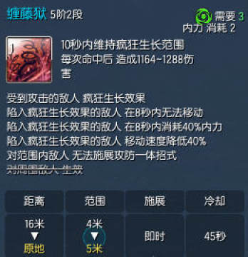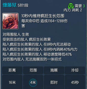 缠藤狱是白青开放的新秘籍之一,因为LZ点数不太够所以一直没点,不过今天试了一下,两个秘籍的区别只有远处释放或者原地释放,施展后会形成一个能造成持续伤害的区域,有点类似板栗球的感觉,所有在范围内包括后来进入的敌人都会得到捆绑效果,不过技能说明似乎有点偏向PVP,总之是一个还蛮有意思的秘籍。