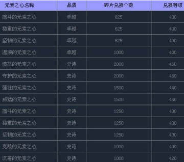 收集一定数量的元素碎片,可以兑换到卓越或史诗品质的元素之心。