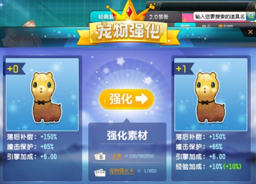 只要在商城内购买“宠物强化卡”就可以对已开启强化的宠物进行强化,每强化一级都会获得更强的数值加成,强化+5将拥有全新形态,强化+10还能在休闲区变身骑宠喔!