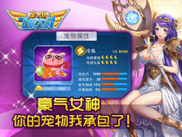 作为古希腊智慧与战争化身的雅典娜女神此次震撼降临,小师妹是越来越感觉压力山大了呀!雅典娜不仅是首款月亮级战机,满级属性高达1000生命值、1200攻击力、250攻速,两个技能更是女神中的白富美,黄金斗士眼里再也没有我了!更惊人的是,雅典娜还普惠天下赐福玩家,在活动期间,升级雅典娜59次直送连我都没见过的萌宠冷兔!女神战机搭配萌宠冷兔,攻击力与技能双双爆棚,我只能哭晕在厕所啦!小师妹只能告诉各位玩家,买一送一也没有这样物超所值的,抓住最后的时机把她们带走吧!