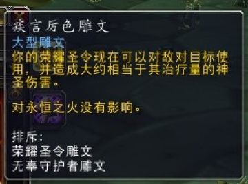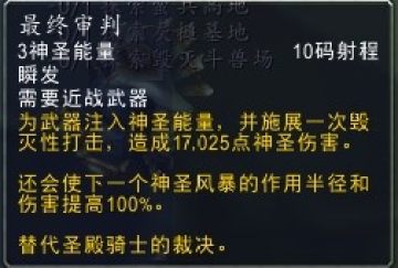 另外如果在副本中。防骑作为DPS出现,在T生存出现问题的情况下,防骑只需要开正义之怒,嘲讽,用正义盾击代替疾言厉色输出,立刻就会变成一个常规T。