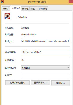 右键恶灵附体的运行软件,点击上方的快捷方式,然后再目标栏输入+com_allowconsole 1,+前面有个空格,按一次空格就行;多按就不管用了,复制就行了。
