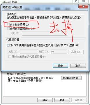 接着进入IE 工具-internet选项-连接-局域网设置 去掉自动检测的勾